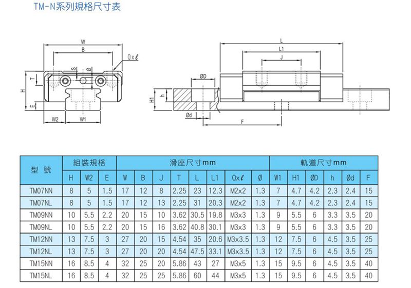 TM微型滾珠直線導軌系列采二列式滾珠循環設計,滾珠軌道設計采哥德式結構,其接觸角為45度,以達到四方向等負荷之效果,充分展現高負荷、高扭矩功能。