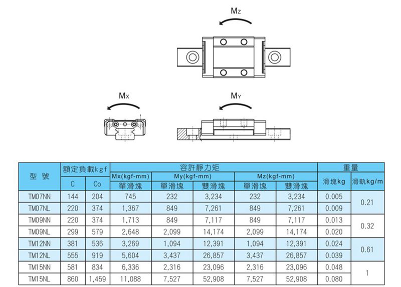 臺灣TBI微型直線滑軌滑塊TM12NN如果所選用的直線導軌副剛性不足,可以提高預壓力,加大選用尺寸或增加滑塊數來提高剛性。靜安全系數定義為靜額定負荷與工作負荷的比值。