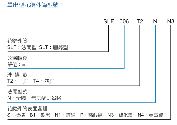 下圖是TBI滾珠花鍵SLF系列的實心斷面形狀,花鍵軸端為法蘭型,在坑能的情況下可以超過溝槽直徑(∅d),SLF系列花鍵通過對花鍵的滾動溝槽進行精密研磨,連到高精度而后與外筒配合