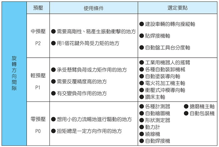 根據用途選定適當的間隙是很重要的。一般來說,都使用有預壓的產品。在進行反復旋轉運動或往返直線運動時由于有很大的振動沖擊,所以事假預壓,會顯著提高壽命和精度。