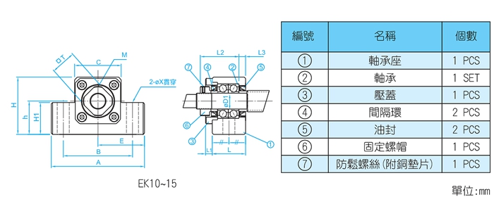 TBI滾珠絲桿支撐座EK25,裝有為超小型滾珠螺桿所開發的接觸角45°的超小型角接觸球軸承,能獲得高剛性、高精度的穩定的回轉性能。